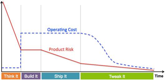 You can also see why we want to shorten the Build It stage as much as possible (high operating cost and little risk reduction). The gradually reduced operating cost in Tweak It reflects that, over time, the product doesn’t need to be updated as much and squads can start moving on to other things.