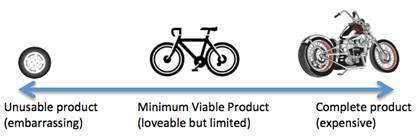 So the squad needs to figure out the smallest possible thing they can build to fulfill the basic narrative and delight the users. We need it to be narrative-complete, not feature-complete. Perhaps a better term is Minimum Loveable Product. A bicycle is a loveable and useful product for somebody with no better means of transport, but is still very far from the motorcycle that it will evolve into. We do need to fulfill the basic narrative though, or our measurements will be misleading: “Hey, we released a wheel, and nobody used it, so the product is a failure and we shouldn’t build the rest of the bike!”
